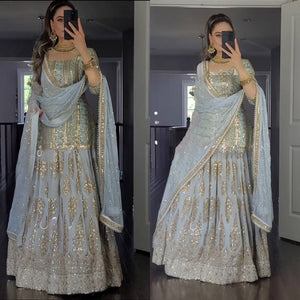 Sky Colour Top Lehenga and Dupatta With Heavy Embroidery Work Set